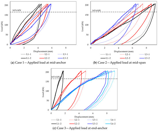 Figure 9 displays the load–displacement curves for the DCP system in the three cases, with the load cell applied at the mid-anchor (Case 1), mid-span (Case 2), and end-anchor (Case 3). Each load case was repeated twice to obtain the average value to ensure accuracy. The full-scale structural tests were successfully conducted, with the recorded data mostly clustering around the average value and exhibiting low standard deviations, as indicated in Table 2. Overall, the DCP system showed a linear response until reaching the target load of 207 kN, which exceeded 125% of the designed load of 165.6 kN. In Figure 9a–c, the observation validated that the structure could uphold its integrity under applied loads with elastic deformations recognized. Notably, the LVDTs’ displacement did not return to the original position after unloading, with the primary cause being localized displacements in the components constituting the anchor. For Case 1, the average displacement values of LVDTs L1, L2, and L3 were 4.35 mm, 5.35 mm, and 5.84 mm, respectively. Even though the LVDT at the mid-anchor indicated the maximum value, these displacements showed only a minor discrepancy. This suggested that the main factor contributing to the DCP displacement was the deformation of the components constituting the anchor, given the negligible deflection of LVDTs observed in the steel DCP, as shown in Figure 9a.