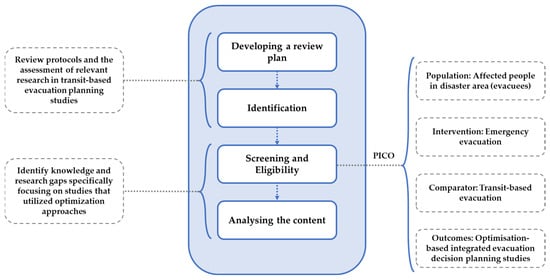 In this study, we adopted the PRISMA methodology, complemented by the PICO framework, for our literature review methodology. The integration of PRISMA with PICO provides a robust and structured approach to systematic literature reviews, offering several unique advantages. PRISMA’s clear and replicable process ensures consistency and transparency in the review, enhancing the credibility and reproducibility of our findings. The inclusion of the PICO framework further refines this approach by enabling precise and focused identification of relevant studies. This framework excels in articulating specific research queries, particularly by distinguishing between in-scope and out-of-scope studies based on well-defined criteria encompassing the population, intervention, comparison, and outcomes. Such a meticulous delineation ensures that the review is comprehensive yet targeted, covering a broad spectrum of literature while maintaining relevance to the research objectives. This combination of PRISMA and PICO not only streamlines the process of sifting through vast amounts of literature but also aids in pinpointing the most pertinent studies, which is particularly beneficial in fields like evacuation planning where diverse methodologies and outcomes are prevalent. Ultimately, this methodological fusion offers a more nuanced and thorough exploration of the subject matter than other conventional review processes.