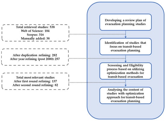 It should be noted that as the left column of Figure 1 shows, the first two steps of the proposed methodology include the definition of the review protocol and the assessment of relevant research related to transit-based evacuation planning studies. The last two steps focus on identifying knowledge and research gaps, with a particular emphasis on research that has utilised optimisation approaches.