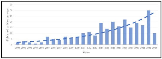 Publication year distribution of the retrieved articles in the Web of Science and Scopus with the trendline.
