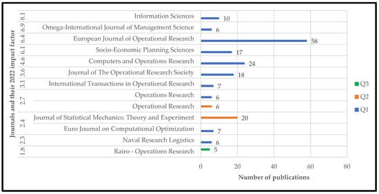 Another noteworthy aspect of this literature relates to the publication titles, including the journals and publishers. Our findings reveal that a substantial number of articles were published by “Elsevier”, “Springer Nature”, “Taylor & Francis”, “Wiley”, and “Informs”. Furthermore, our analysis of the most frequently cited journals in this field reveals that the European Journal of Operational Research, Computers and Operations Research, Journal of Statistical Mechanics: Theory and Experiment, Journal of The Operational Research Society, Socio-Economic Planning Sciences, Information Sciences, and International Transactions in Operational Research were among the most popular. Figure 4 illustrates the top journals that have focused on publishing a significant number of studies in this research area along with the journals’ 2022 impact factor and their CiteScore Best Quartile. In the next section, based on the refined studies, content analysis and comprehensive research gap analysis are presented.