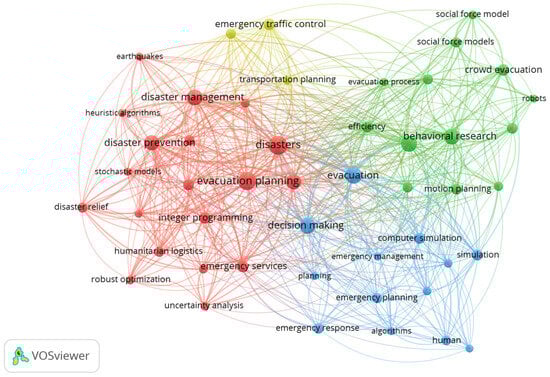 To capture a broad view of all of the retrieved studies (i.e., 538 articles), a “keywords co-occurrence analysis” was performed here to provide a clearer view of the current body of knowledge. In this regard, by using VOSviewer (version 1.6.18) software and the structural keywords presented before, a keyword co-occurrence analysis map is conducted on the retrieved data sets from the Scopus and Web of Science results. Setting the co-occurrence minimum value of 10 and choosing a “Network Visualization” or “a map based on bibliographic data” analysis, in a “full-counting” status, 48 keywords meet the threshold out of 2806 keywords. The results are presented in Figure 5. As this map shows, four clusters are detected in the retrieved studies. The red cluster shows some key aspects of the body knowledge, including significant problems like “disaster evacuation”, “evacuation planning”, “disaster relief”, and “humanitarian logistics”. Also, the papers that fall in this cluster are associated with some keywords that show the solution method that has been used for such problems, i.e., “robust Optimisation”, “uncertainty analysis”, and “heuristic algorithm”. The blue cluster is closely related to the red cluster with terms such as “decision making”, “evacuation”, “planning”, and “emergency response”, addressing evacuation problems that have utilised simulation and computational algorithms. The green cluster with keywords such as “behavioural research” and “crowd evacuation”, is associated with the behaviour of people during evacuation operations, mainly related to evacuations from dense areas or buildings. Social science methodologies are the dominant approach to these problems. Finally, the yellow cluster with terms such as “transport planning” and “emergency traffic control” contains network flow and traffic management problems during emergency evacuation operations.