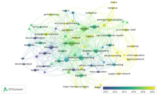 A co-occurrence analysis of bibliographic data is conducted to create an “Overlay Visualization”, illustrating the evolution of research terms over the past years. By setting the minimum value 2 and choosing “a map based on bibliographic data” analysis, in a “full-counting” status, 71 keywords meet the threshold out of 313 keywords. As this map shows in Figure 6, traditional concepts in the field of the study include “evacuation”, “transportation”, “resource allocation”, and “preparedness”. However, new concepts have emerged, and they encompass “Optimisation”, “relief distribution”, “supply chain network”, “uncertainty”, “evacuation routing”, and “resilience”.