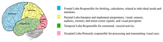 Hans Berger discovered EEG activity in 1929 and invented a technique for measuring EEG with the goal of providing “a window to the brain.” There are five main brain waves in the human brain, as shown in Table 1, ranging in frequency from low to high. These waves are closely related to states such as sleep, thought, cognition, arousal, and increased coordination when the brain is processing tasks. A typical EEG is made up of different frequency bands, and depending on the state of consciousness in which it is located, a specific brain wave will dominate, implying that different frequencies of brain waves correspond to different brain activities []. Different EEG frequency bands correspond to different subjective feelings and tasks, and the energy or work power spectral density (PSD) of the EEG waves in each frequency band can indicate that different parts of the brain are activated, reflecting different physiological states [].