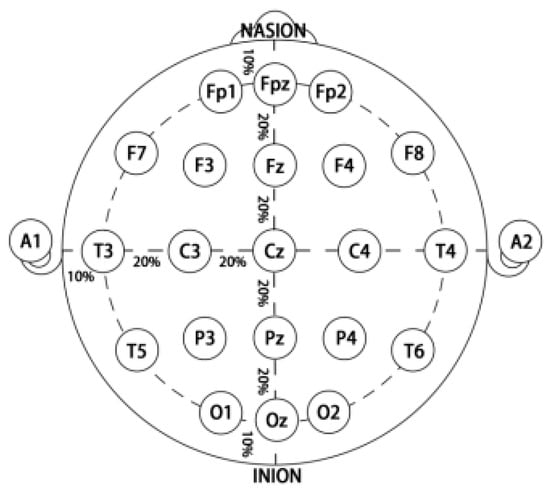 The International 10–20 system electrode placement method, as shown in Figure 2, is a standard electrode placement method prescribed by the AASM (American Academy of Sleep Medicine) that is designed to maintain a standardized EEG testing methodology to ensure that the results of a subject’s study can be compiled, replicated, and validly analyzed and compared using the scientific method.