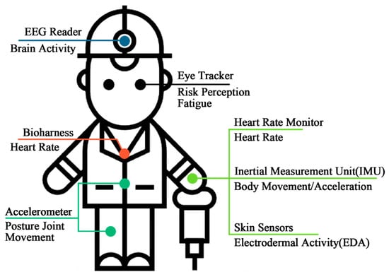 In the field of construction, the commonly used portable monitoring equipment is shown in Figure 3. It mainly includes electroencephalogram, eye movement meter, accelerometer, skin temperature sensor, heart rate monitor, inertial measurement unit, and so on. People’s physiological signals can be monitored by various portable devices. Electroencephalograms (EEGs) can be used to monitor EEG signals, which are critical for judging construction unsafe behaviors and workers’ adverse reactions; construction workers can also wear portable eye-tracking devices to determine risks during the work process []; and skin temperature sensors can monitor the skin temperature of construction workers in the moment to obtain the thermal sensation situation at the moment. Millions of people in various industries, including construction workers, use personal portable devices on a daily basis to monitor their heart rate and other health-related physiological parameters to ensure their well-being [,]. Nnaji et al. [] demonstrate, using data from the National Institute for Occupational Safety and Health (NIOSH) fatality data, that the likelihood of accidents can be greatly reduced by the prudent use of intelligent portable monitoring devices.