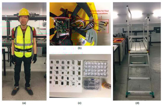 Experimental apparatus: (a) experiment subject; (b) EEG hardhat and the EEG monitoring chips; (c) nuts and bolts; (d) ladder platform [].