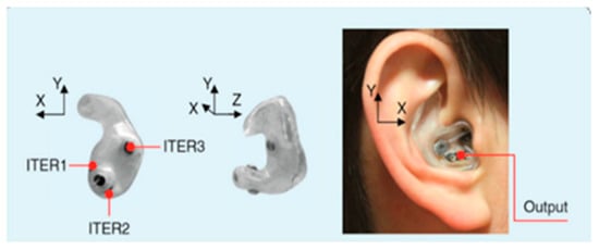As shown in Figure 5, Looney et al. [] developed the world’s first ear-EEG in 2012, which drew widespread attention at the time. In general, the benefits of using ear-EEG for monitoring include the fact that it does not obstruct the field of view and that the ear-EEG is usually fixed in the ear canal for measurement, making it securely positioned and less likely to fall off. The ear is also less likely to sweat, avoiding the effects of electrode impedance caused by excessive sweating. While scalp EEG may require the assistance of experienced assistants, the ear-EEG device can be simply placed in the subject’s ear, saving labor and improving the stability of continuous monitoring and monitoring efficiency.