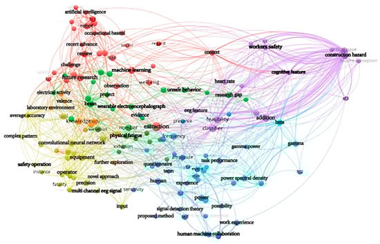 In this paper, we also use VOSviewer [] to analyze the related keywords; the core idea of VOSviewer1.6.18 software is “co-occurrence clustering,” which means that two things appearing at the same time are related to each other; there are many types of such correlations, and their strengths and directions differ; different types of groups can be found based on the clustering of measures of the strengths and directions of the relationships. Clustering based on measures of the strength and direction of the relationship can be used to identify different types of groups. The co-occurrence visualization graph, shown in Figure 6, displays scientific terms that appear at least three times in all titles and abstracts. The size of the nodes indicates the frequency of a phrase in the entire literature, the thickness of the line indicates the strength of the association between the phrases, and the color of the same line indicates the proximity between the phrases.
