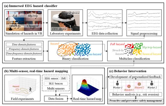 Wang et al. [] used a real-world construction site as a stimulus. Sixty-one construction workers were selected and shown 120 images, and their EEG signals were recorded as they viewed the images. ERP (event-related potential) evoked by safety and dangerous images is extracted from EEG signals, which is a special brain-evoked potential that can reflect the neuroelectrophysiological changes of the brain during the cognitive process []. The correlation between EEG prediction and self-reported work experience was calculated by using a nested cross-validation algorithm to train the prediction model to evaluate the performance of the prediction model. Subsequently, predictive values were used to predict participants’ behavioral outcomes and casualty experiences to assess the external validity of the model. Finally, the predictive model is tested on an independent data lockbox for out-of-sample validation. The model demonstrates comparable predictive accuracy for workers with different risk propensities and educational backgrounds, eliminates the interference of specific risk types on model performance, and highlights the feasibility of identifying individual characteristics of hazard recognition based on physiological signals. Jeon et al. [] discovered that the presence of hazards in the built environment could be identified by mood changes using portable EEG sensors in hazardous areas. In a subsequent study, Jeon et al. [] combined a portable EEG device with immersive virtual reality (VR) to develop an EEG classifier to detect the presence of hazards in building construction. According to the study’s findings, the CatBoost classifier performed the best, with an accuracy of 95.1%. Furthermore, three critical channel locations (AF3, F3, and F4) and two frequency bands (Beta and Gamma) were found to be closely related to hazard perception. In 2022, Jeon’s team [] correlated EEG signals with the types of hazards that are likely to occur in construction, as well as conducted experiments in the VR environment, to develop another EEG classifier that simulated construction in the VR environment with different hazardous situations, such as worker falls and circuit tripping. During the experiment, EEG signals from subjects wearing EEG and VR devices were recorded at the same time. For training and testing, two types of EEG features (time/frequency domain features and cognitive features) were extracted, and the EEG classifier was built using 18 advanced machine learning algorithms. Based on a 7-class categorized set of cognitive features, the LightGBM classifier achieves 70.1% accuracy. Jeon et al. [] relabeled the input data and designed and tested three strategies to improve performance even further. The two-step integrated classification method achieved 82.3% accuracy, according to the results. As a result of the preceding research, we can recognize and distinguish the hazards present in buildings by combining EEG, VR, and ML (machine learning) methods. In the same year, Jeon et al. [] synthesized previous research and proposed an EEG-based framework for universal hazard identification and active safety management. The framework, as shown in Figure 8, is made up of three parts: (a) the creation of an immersive EEG hazard classifier; (b) multi-sensor, real-time hazard mapping; and (c) behavioral intervention. The framework’s feasibility is validated by focusing on the first component (immersive EEG hazard classifier), which is based on an indoor laboratory experiment. The overall framework is depicted in Figure 8. The binary classifier was found to be capable of classifying hazard-related EEG signals with an accuracy of 93.7%, while the multi-class classifier was capable of classifying EEG signals into five different hazard types with an accuracy of 79.3%. It greatly advances the process and development of construction safety management by providing a toolbox that can better identify construction hazards and helps to reduce the occurrence of hazardous events on construction sites.