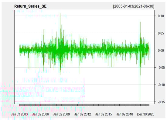 Since the standard GARCH (1, 1) model, where p = 1 and q = 1, is the most extensively applied and examined model in the literature, we have used this model as our benchmark. Regarding the mean equation, denotes the return of the sector index at time t, and is the mean of given the information from the past period t − 1,…,. m is the order of the autoregressive process (AR-process) with k = 1,…, m lags of returns, and n is the order of the moving average process (MA-process), with l = 1,…, n lags of the error term.