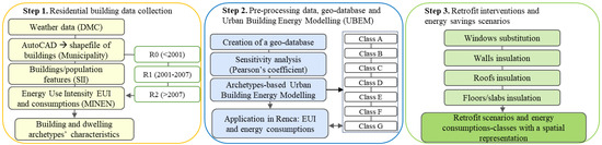 The methods and tools applied in this study have allowed a path to be recognized to move towards modeling building energy performance on an urban scale with limited available spatial and energy consumption data. This is particularly relevant for urban planners and decision-makers in low-income municipalities where the relationship between the performance of the urban fabric and household energy consumption is still not well understood. The proposed archetype- and GIS-based UBEM provides criteria and strategic interventions requiring a small amount of investment and with payback being achieved over a short period of time, to contribute to a reduction in energy demands. For further studies to be performed, an overview of the methods applied in this study is given below.