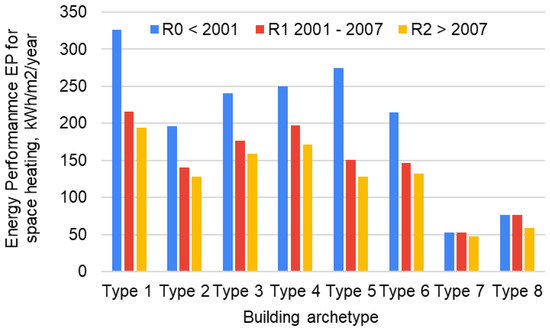 Figure 3 illustrates the space-heating energy demand for the entire sample of dwelling archetypes categorized by construction periods: R0, R1, and R2 [61]. For dwellings built before 2001 (period R0), no thermal insulation was used on any envelope element; for those built between 2001 and 2007 (period R1), roof insulation was used to comply with the minimum thermal transmittance Uroof of 0.47 W/m2/K; for dwellings built after 2007 (Period R2), additional insulation was used for the external walls to meet a minimum of Uwall = 1.9 W/m2/K and for the external floor/slabs to meet a minimum of Ufloor = 0.7 W/m2/K.