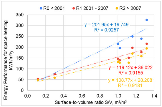To estimate the space-heating energy demand of dwellings at the urban level, the EUI of each archetype was calculated, taking into account the respective S/V ratio by period of construction and the heated volume (in Figure 4). As depicted in the graph on Figure 4, linear regression equations were generated for the sample of archetypes in each regulatory period, attaining good coefficients of determination: 0.93 (period R0) and 0.92 (periods R1 and R2).