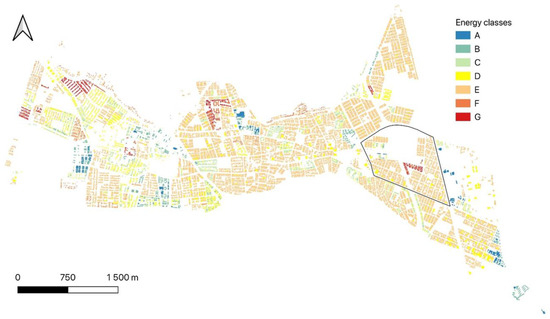 In turn, the 3D model of the built environment compiled with QGIS was used to map the distribution of the characteristics of residential buildings (i.e., period of construction, S/V, and percentage of occupied dwellings) across the entire city. The resulting map plotted in Figure 5 is consistent with the three main residential areas of the district, which can be clearly recognized as follows: