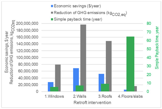 Then, the percentage of energy savings and the costs of four main retrofitting measures on the envelope of the buildings were applied to the residential buildings to evaluate the new consumption, resulting energy savings, payback times of the interventions, and reduction in GHG emissions. In Chile, the more convenient retrofitting intervention is wall insulation, followed by roof insulation, window substitution, and then floor/slab insulation. The aim of this study was to evaluate the possible energy and climate targets considering the real characteristics of the building stock.