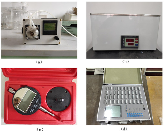 The main equipment selected in this study is shown in Figure 1, among which is the pump (the manufacturing year was 2016, the equipment origin is China, and the equipment manufacturer is the United Zhongwei Technology Company (Huizhou City, China)), the HH-2 constant-temperature water bath pot (the manufacturing year was 2021, the equipment origin is China, and the equipment manufacturer is Anhui Haixin Technology Co., Ltd. (Wuhu City, China)), the digital display dial gauge (the manufacturing year was 2022, the equipment origin is China, and the equipment manufacturer is Ai Ce Instrument Co., Ltd. (Taizhou City, China)), and the YBY4010 data acquisition system (the year of manufacture was 2016, the origin of the equipment is China, and the equipment manufacturer is Liyang Weihan Instrument Factory (Liyang City, China)).
