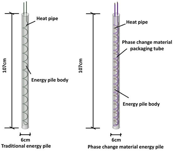According to the research needs, the pile mold of the indoor scale model is designed and processed, and the traditional energy pile scale model and the spiral tube-encapsulated PCM energy pile scale model are completed through the pile mold. The model pile length of the two scale models is 107 cm, the diameter is 6 cm, and the length–diameter ratio of the pile is 17.8. The details of the model pile specimen are shown in Figure 4. The outer diameter of the heat conduction pipe in the pile is 5 mm, the inner diameter is 4 mm, and the total length is 2.8 m. The length of the spiral pipe is 1.8 m and the length of the straight pipe is 1 m. The outer diameter of the phase change material packaging pipe in the pile is 7 mm and the inner diameter is 6 mm. The length of the spiral pipe is 1.8 m, and the length of the straight pipe is 1 m.