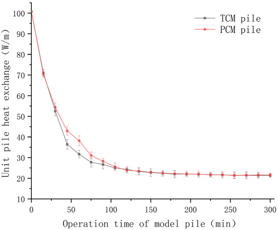According to Formula (1), the heat transfer per unit of the pile body of the TCM pile and the PCM pile is calculated and plotted, as shown in Figure 6.