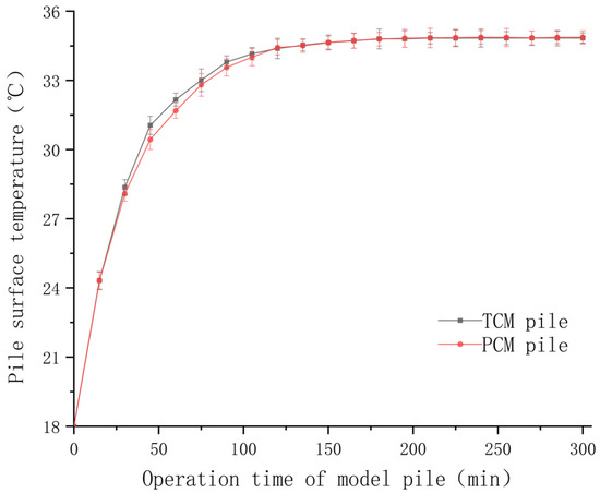 As shown in Figure 7, the surface temperature of the TCM pile and the PCM pile gradually increases with time during the whole operation process, and finally, the surface temperature of the two piles is stable at approximately 34.8 °C. During the period from 30 min to 120 min, the surface temperature of the TCM pile is obviously higher than that of the PCM pile. The difference between the two first increases and then decreases with the increase in time. The maximum difference between the two appears at 45 min, and the maximum difference is 0.62 °C. In this operation stage, the heating rate of the TCM pile is obviously faster than that of the phase-change pile.