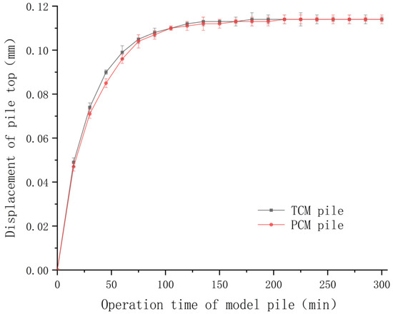 It can be seen from Figure 8 that the pile top displacement values of TCM piles and PCM piles gradually increase with time, while the growth rate is faster in the early stage and gradually tends to stabilize in the later stage. Finally, the pile top displacement values of both piles are stable at 0.114 mm. During the first 0–15 min of operation, the displacement values of the pile top of the TCM pile and the PCM pile are basically the same; during minutes 15–105 of operation, the displacement value of the pile top of the TCM pile is significantly higher than the displacement value of the pile top of the PCM pile. The difference between the two first increases and then decreases. The maximum difference occurs at 45 min, and the maximum difference is 0.005 mm; during minutes 105–300 of operation, the displacement value of the pile top of the TCM pile is not much different from that of the PCM pile, but the change in the displacement value of the pile top of the PCM pile lags behind the displacement value of the pile top of the TCM pile between 105 min and 195 min.