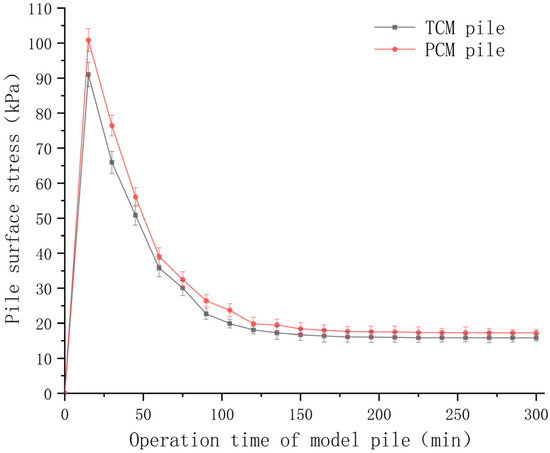 During the whole operation process, the surface stress value of the PCM pile is higher than that of the TCM pile. The maximum difference between the two appears at 15 min, the maximum difference is 9.84 kPa, and the maximum difference is 10.8%. The difference between the two gradually decreases with time, and finally stabilizes at 1.4 kPa. The final difference is only 8.8%, and the negative impact on the pile material is minimal.
