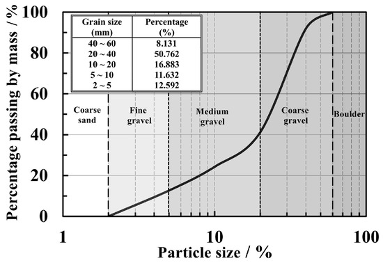 Both types of coarse-grained soil specimens were equally well graded. The grading curve is shown in Figure 2. The curvature coefficient (Cc) was 1.49, and the uniformity coefficient (Cu) was 6.26, categorizing the gravel as well-graded gravel (GW) according to engineering classification [32].