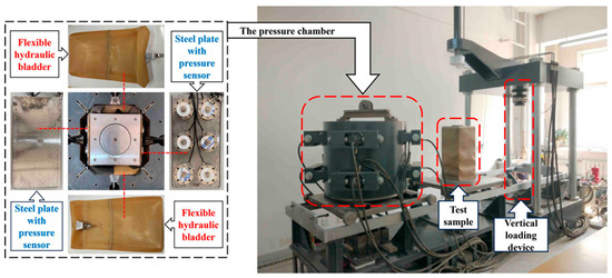 The planar strain testing apparatus was modified from a large-scale true triaxial device [33]. Using this apparatus, vertical loading is achieved via rigid bidirectional symmetric loading, and the horizontal confinement pressure is applied using flexible hydraulic latex capsules. The modification for planar strain in the pressure chamber involved the use of a pair of smooth steel plates instead of a pair of radial hydraulic bags. Behind each steel plate, there are six pressure sensors, and bolts mounted on the pressure sensors can control the distance between the steel plate and the inner wall of the pressure chamber. This enables the specimen to be maintained in a planar strain state while lateral confinement pressure is also applied. The modified planar strain pressure chamber is depicted in Figure 3. The test included confinement pressures of 100 kPa, 200 kPa, 300 kPa, and 400 kPa, with a vertical loading rate of 0.6 mm/min [32]. The vertical strain was loaded to levels of 0.5%, 1%, 3%, 6%, and 10%; after each of these levels was attained, the vertical stress began to unload at a rate of 0.06 mm/min [31]; this was followed by reloading until the confinement pressure was reached. The test was stopped when the vertical strain reached 15% [32].