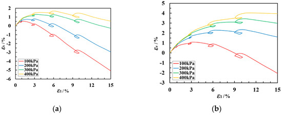 Figure 4 illustrates the relationship between the εv (volumetric strain) and ε1 (axial strain) on coarse-grained soil during the plane strain cyclic loading–unloading shear test. The volumetric strains on both types of coarse-grained soils exhibit characteristics of shear contraction followed by shear dilation. Soil A exhibits evident shear dilation at lower confining pressures, but this dilation diminishes as the confining pressure increases, although it tends to shift back to dilation with increased vertical strain. Soil B only exhibits noticeable shear dilation at 100 kPa, with shear contraction deformation at other confining pressures. It can also be observed that Soil A—with better roundness and a smaller void ratio—exhibits more pronounced shear dilation than Soil B. With a constant vertical loading rate, greater lateral dilation means that shear dilation is more likely to occur. Because the particles of Soil A are rounder and the sample has fewer voids under compression and shear, both intact and broken soil particles are more likely to move laterally in the direction of the lower confining stress, resulting in more significant lateral dilation. In contrast, Soil B, with its poorer particle roundness, exhibits more evident particle interlocking. This makes particle sliding more challenging, and the larger voids in the sample mean that both intact and broken particles are more likely to fill these internal voids, resulting in smaller lateral dilation.