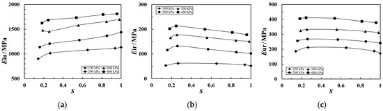 Figure 6 illustrates the moduli in cyclic loading–unloading tests. It can be seen that the Ei (initial tangent modulus) corresponds to the tangent modulus during the first loading segment (segment OA in Figure 6); the Eiu (initial unloading modulus) represents the tangent modulus during various unloading segments in the cyclic loading–unloading test (segments AC in Figure 6); Eir denotes the initial reloading modulus during various reloading segments (segments CD in Figure 6); and the Eur (unloading–reloading modulus) corresponds to the slope of the line connecting the two intersection points of the hysteresis loop (points B and C in Figure 6). The stress level S at each unloading point is calculated using Equation (1), and the variations in Eiu, Eir, and Eur for both coarse-grained soils under different confining pressures with S are shown in Figure 7 and Figure 8, respectively.
