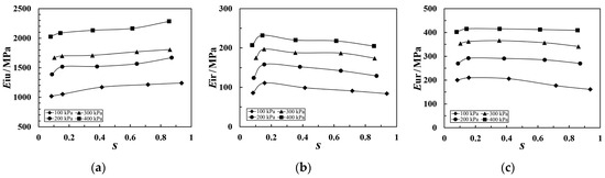 Relationship between modulus and S for Soil B with different moduli of (a) Eiu, (b) Eir, and (c) Eur.