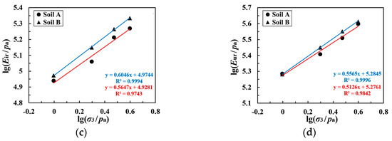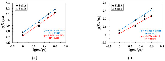 As can be seen in Figure 9, lg(Ei/pa), lg(Eiu/pa), lg(Eir/pa), and lg(Eur/pa) each exhibit a linear relationship with lg(σ3/pa). We may say, therefore, that Equation (2) can reasonably predict the various moduli of coarse-grained soil under different confining pressure conditions in unload–reload tests. The parameters of the various moduli for the two types of coarse-grained soil are presented in Table 3.
