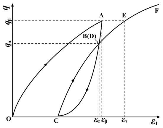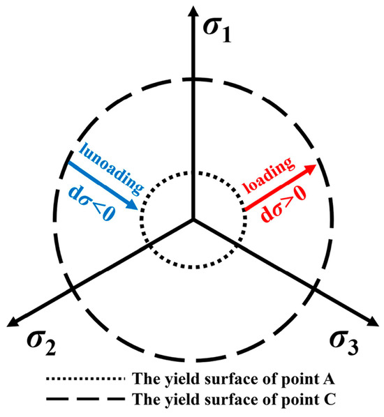 In Figure 10, point D on the reloading segment CF coincides with the unloading point B, with both points having the same stress qα and strain εα. Upon reloading to point E, the stress qβ matches that at point A, but the strain εγ at point E is greater than the strain εβ at point A. Conventional plasticity theory suggests that the position of the yield surface is related only to the historical maximum stress qmax and not to the stress path [34]. As depicted in Figure 11, during unloading, the yield surface contracts from A to C. The reduction in stress level causes soil particles to rebound and the particle fabric to redistribute. Upon reloading, the stress increment dσ on the yield surface of point C, directed outward, results in new plastic strains. Consequently, points A and E in Figure 10 do not coincide, and so it is not entirely appropriate to consider segment CE as merely nonlinear elastic deformation. Both the initial loading and reloading deformations should be treated as elastoplastic deformations. For the present study, therefore, we employed a combined theory of elastoplasticity and nonlinear elasticity to establish a constitutive model for the unloading–reloading of coarse-grained soil under plane strain conditions.