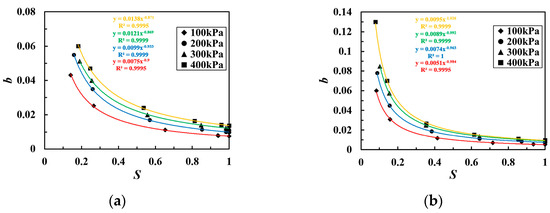 The fitting curve of the relationship between b and S for coarse-grained soil of the following types: (a) Soil A and (b) Soil B.