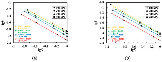 Taking the logarithm on both sides of Equation (12), we can obtain Equation (14). The fitting relationship between lg b and lg S is shown in Figure 13, where they have a relatively good linear relationship.