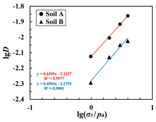 The relationship between lgD and lg(σ3/Pa) is shown in Figure 14; here, again, a relatively good linear relationship can be seen.