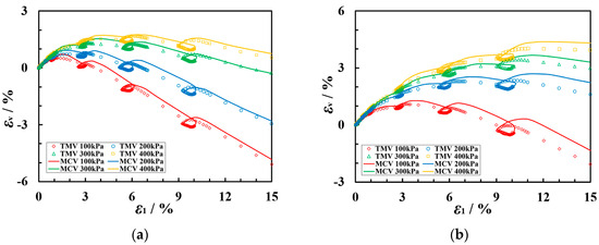 The εv-ε1 curves of TMVs and MCVs for coarse-grained soil of the following types: (a) Soil A and (b) Soil B.