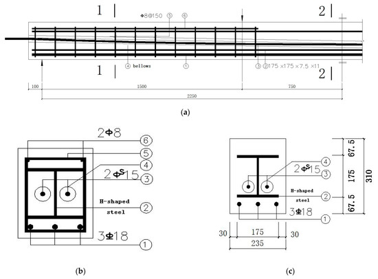 The H-shaped steel in the PSRC beam is arranged in the center of a PSRC beam section. In addition, the shear section is equipped with a sufficient amount of truss reinforcement and stirrup to ensure that the slope section of the beam will not be damaged due to insufficient shear capacity during the test. The section, reinforcement, and structure details of the PSRC beams are shown in Figure 1.