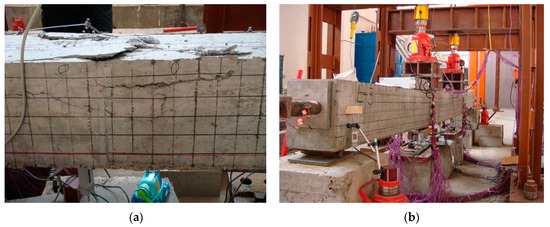 PSRC test beam failure. (a) The concrete is crushed in the pure bend section of the beam; (b) The beam reaches the limit state of normal section load-carrying capacity.