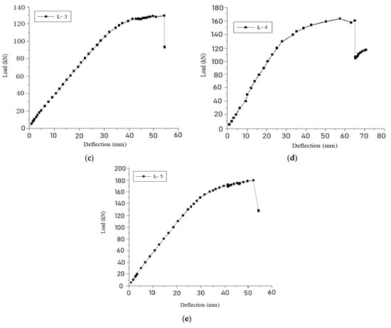 Load and mid-span deflection curve of PSRC test beams. (a) L-1; (b) L-2; (c) L-3; (d) L-4; (e) L-5.
