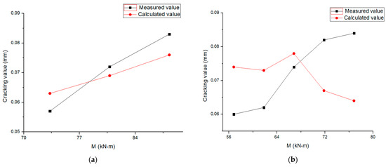 According to the above formula for calculating the average crack width, the calculated and measured values of the average crack width of the 5 PSRC beams before the tensile flange of the shaped steel yield are shown in Figure 5. The crack width values of the test beam were read with 100× and 24× reading magnifiers. The average value of crack widths under different loads in the pure bend section of the beam and the main crack widths in the shear span section are taken.