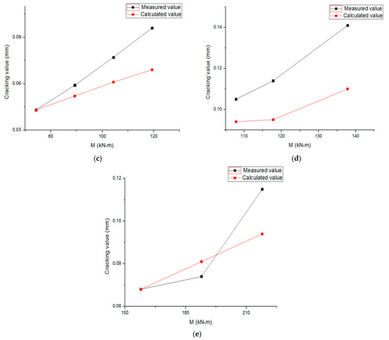 Calculated and measured values of the average crack width of the test beam. (a) L-1; (b) L-2; (c) L-3; (d) L-4; (e) L-5.