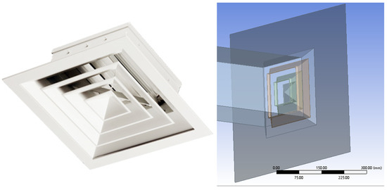 Diffusers are the terminals of the air conditioning system, while the specific air jet results from the complex internal structure of the diffusers, which will dominate the room air movement. Therefore, the jet effect of the diffuser is an important factor affecting the indoor environment [12,13]. With the development of computers, computational fluid dynamics (CFD) simulation has been widely used for evaluating indoor environments [14,15]. Many scholars have numerically studied and analyzed the air distribution of diffusers. Aziz et al. [16] studied the airflow characteristics of diffusers with different geometry structures (i.e., vortex, round, and square). Their effects on the indoor thermal comfort were analyzed through both numerical and experimental methods. Nocente et al. [17] conducted a numerical simulation to characterize the impact of diffuse ceiling ventilation on the internal comfort of a typical office room and compared the performance between continuous and non-continuous diffuser designs. Li et al. [18] studied the uniform and non-uniform velocity inlet boundary conditions for simulating diffusers, as well as the effects of different boundary conditions on the jet characteristics and airflow distribution.