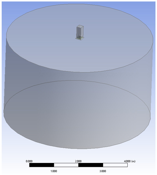 We assumed that the inlet of the diffuser (267 mm × 267 mm × 530 mm) was a straight pipe and the length of inlet pipe was twice the length of the pipe diameter to form a stable inlet flow. Meanwhile, to avoid the influence of the external area on the diffuser outlet airflow distribution, the outlet of the diffuser was set to be an infinite fluid area, so the outlet of the diffuser was set to be a cylindrical fluid area R3 000 mm × 3500 mm, as shown in Figure 3. According to the internal structure of the four-way square diffuser, its guide vanes separated the outlet section of the diffuser into three circles: outer, middle, and inner.