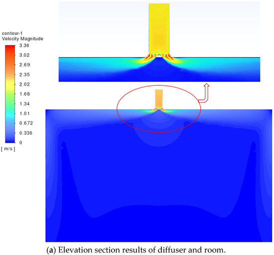 Similarly, the simulation calculations were carried out with the diffuser delivering an air volume of 213 m3·h−1, and the results of the distribution of the airflow in the outlet cross-section could be obtained. The characteristics of the diffuser were consistent with those of one delivering an air volume of 295 m3·h−1.