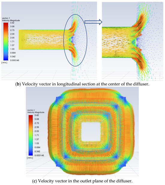 When the airflow was defined in the straight inlet section of the diffuser, we could conduct calculations to obtain the airflow distribution in the outlet section of the diffuser. Figure 4 shows the results of the airflow distribution in the outlet section of the diffuser with an air volume of 295 m3·h−1. From Figure 4a, it can be seen that the airflow in the outlet section of the diffuser had an angle greater than 45 degrees to the Z-axis, and spread in all directions in a radial shape; Figure 4b shows that the velocity distribution of each circle was different due to the guide effect of the blades on each circle, and there was a return area in the center of the diffuser; Figure 4c shows the velocity vector of the outlet cross-section of the diffuser, and the velocities in its four corners decreased sharply.