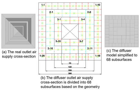 In view of the complex non-uniform airflow distribution in the outlet cross-section of the diffuser, when we simulated the four-way square diffusers in the room (Figure 6a), we divided the diffuser outlet air supply cross-section into 68 subsurfaces based on the geometry, as shown in Figure 6b. The diffuser model was simplified to 68 surfaces using the N-point air supply opening model, and N = 68, as shown in Figure 6c. The airflow velocities in each of the three directions XYZ for the 68 subfaces can be defined during the simulation calculation.