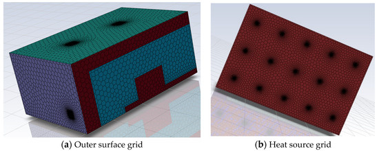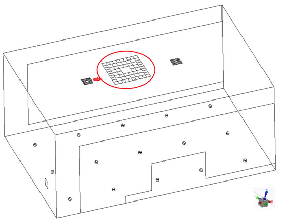 The geometry features of the experimental room, including the distribution of indoor heat sources, and the size and location of the return air outlet, were constructed in Workbench2021 R2, and both diffusers were modeled as a 68-point air supply opening model, as in Figure 7. The computational region was discretized using a polyhedral mesh with a locally encrypted 1-mm mesh for the diffuser air supply cross-section, a locally encrypted 1 mm mesh for the heat source surface, and a locally encrypted 5 mm mesh for the return air outlet. The maximum size of the grid was 0.2 m, and there were 3 boundary layers in total. The simulation began with mesh sensitivity analysis, starting with a very general computational network, improving it gradually to find the best balance between accuracy and computational effort. The final model grid is shown in Figure 8, with a grid orthogonal mass of 0.2.