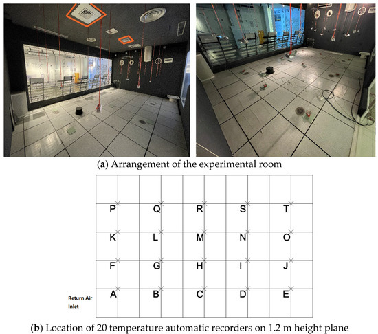 Theoretically, the indoor air velocity flow field between the simulation and experiment results should be compared, but this paper just compares the indoor temperature field between them to validate the proposed simplified method based on the following reasons: (1) indoor 3D wind speed is not easy to measure, (2) if anemometers are placed, the indoor flow field will be damaged, causing inaccurate measurement results, and (3) the temperature automatic recorders will have a smaller impact on the indoor temperature field. Altogether, 20 temperature automatic recorders (Testo174, Product of Testo from Titisee-Neustadt, Germany) were hung at the 1.2 m height plane in a uniform distribution, and all the temperature sensors were shielded underneath with aluminum foil to prevent thermal radiation from the electric stoves on the floor which could cause inaccuracy in the measurement data. The recording interval of the temperature sensors was set to 1 min, and one temperature sensor was placed on the inner wall of the glass in the experimental room to observe the change in indoor temperature, which was used to evaluate the stability of the experimental conditions. Figure 9 shows the experimental room and its arrangement.