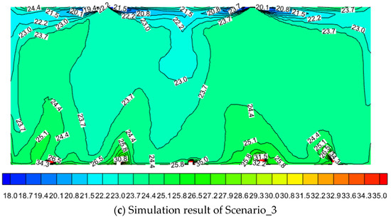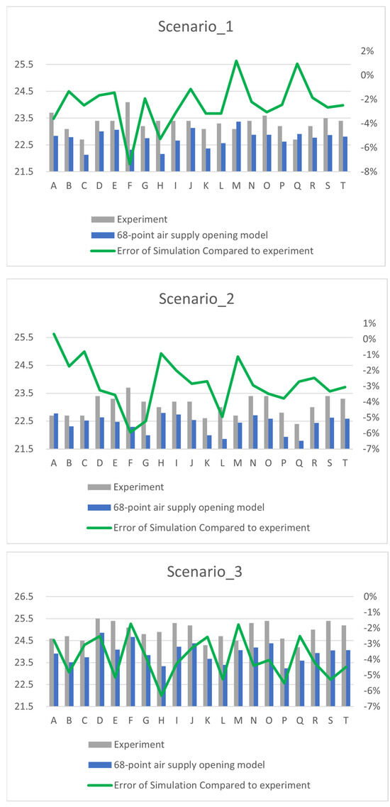The indoor temperature distribution of each scenario could be obtained after the error correction. As shown in Figure 10, the simulated temperature distribution of the 20 points at the height of the 1.2 m working surface was quite consistent with the measured ones for the three scenarios, whose deviations were between −7.4~1.7%. In addition, the root mean square error of temperature for the three scenarios was 0.7 °C, 0.7 °C, and 1.0 °C, respectively. But the error was overall negative, and the simulation temperature was lower than the measured temperature. The possible reason was that instrument error of the balanced flow meter made the actual air volume smaller and the indoor temperature higher.